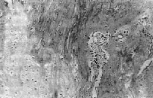 大约在骨折后的2~3天,从骨内膜及骨外膜增生的纤维母细胞及新生毛细血管侵入血肿,血肿开始机化。这些纤维母细胞实质上多数是软骨母细胞及骨母细胞的前身。上述增生的组织逐渐弥合,填充并桥接了骨折的断端,继而发生纤维化形成纤维性骨痂,或称暂时性骨痂(provisional callus)肉眼上骨折局部呈梭形肿胀。约经1周左右,上述增生的肉芽组织及纤维组织部分可进一步分化,形成透明软骨。透明软骨的形成一般多见于骨外膜的骨痂区,而少见于骨髓内骨痂区,可能与前者血液供应较缺乏有关。此外,也与骨折断端的活动度及承受应力过大有关。但当骨痂内有过多的软骨形成时会延缓骨折的愈合时间。