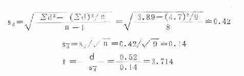 式中,0为差数年总体均数,因为假设处理前后或两法无差别,则其差数的均数应为0,d为一组成对数据之差d(简称差数)的均数,其计算公式同式(18.1);Sd为差数均数的标准误,sd为差数年的标准差,计算公式同式(18.3);n为对子数。 因计算的统计量是t,按表19-4所示关系作判断。 例19.5 应用某药治疗9例高血压病人,治疗前后舒张压如表19-5,试问用药前后舒张压有无变化? 表19-5 高血压病人用某药治疗前后的舒张压(kPa)