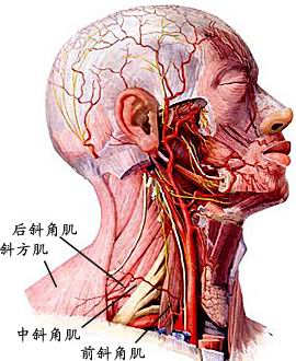 (2)颈外动脉:沿胸锁乳突肌深面上行,穿腮腺实质,移行为颞浅动脉和上颌动脉两大终支。 (2) the external carotid artery: sternocleidomastoid deep along the surface line, wearing the parotid parenchyma, shifting behavior superficial temporal artery and the two terminal branches of the maxillary artery.