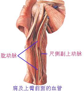 (2)肱动脉:为腋动脉的延续,在肱二头肌内侧下降至肘窝,分为尺动脉和桡动脉。 (2) of the brachial artery: for the continuation of the axillary artery in the medial biceps down to the cubital fossa, into the ulnar artery and radial artery.