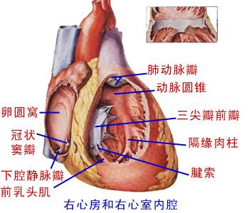 位于心的右上份,腔大壁薄,主要结构有右心耳、梳状肌、卵圆窝等。 Located in the heart of the right upper parts of large thin-walled chamber, the main structure of the right atrial appendage, comb muscle, oval fossa.