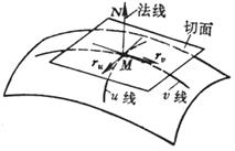 For surfaces represented by parametric or vector expressions, if a series of numerical values L is taken and u is continuously changed, then r ( u , )( i =1,2, L ) represents a family of curves, called u -lines (Figure 7.23 ). ); similarly, if u is a series of values u 1 , u 2 , L , and let it vary continuously, then r ( u i , )( i =1,2, L ) represents another family of continuous curves, called lines . The u line and the line form a curve network on the surface, which is called coordinate line or coordinate network . So u = u i ,![]()